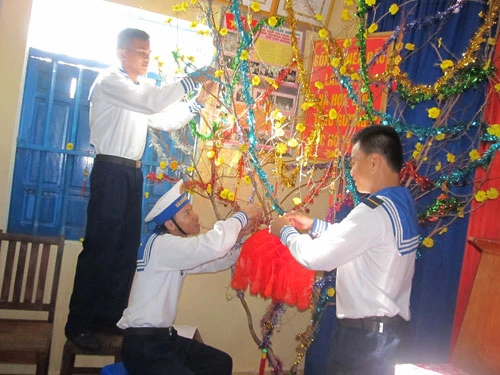 Các chiến sĩ Trạm radar Thổ Chu trang trí hoa mai chuẩn bị đón tết.