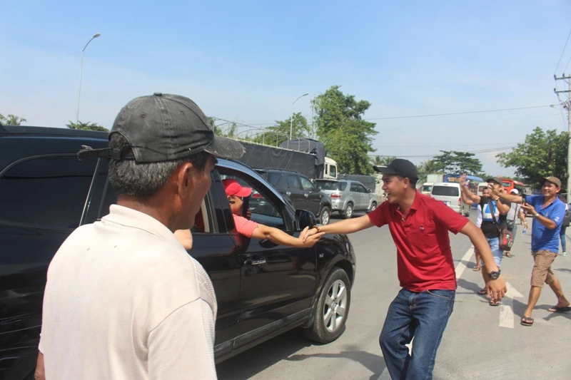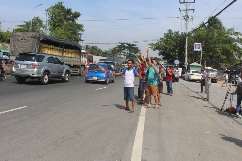 Một số người vẫy tay chào xe qua trạm BOT cai Lậy khi xả trạm (ảnh ĐÔNG HÀ)