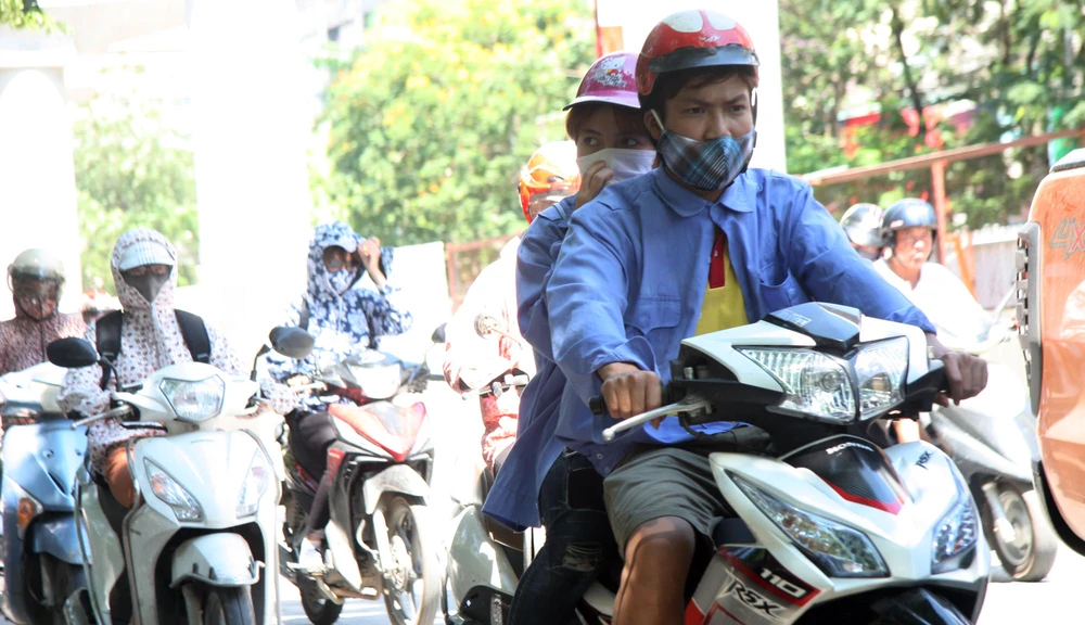Bên ngoài đường, nhiệt độ vào khoảng 40-41 độ C. Khẩu trang, áo chống nắng, kính là vật dụng không thể thiếu của người dân mỗi khi ra đường vào những thời điểm nắng nóng đỉnh điểm như vậy.