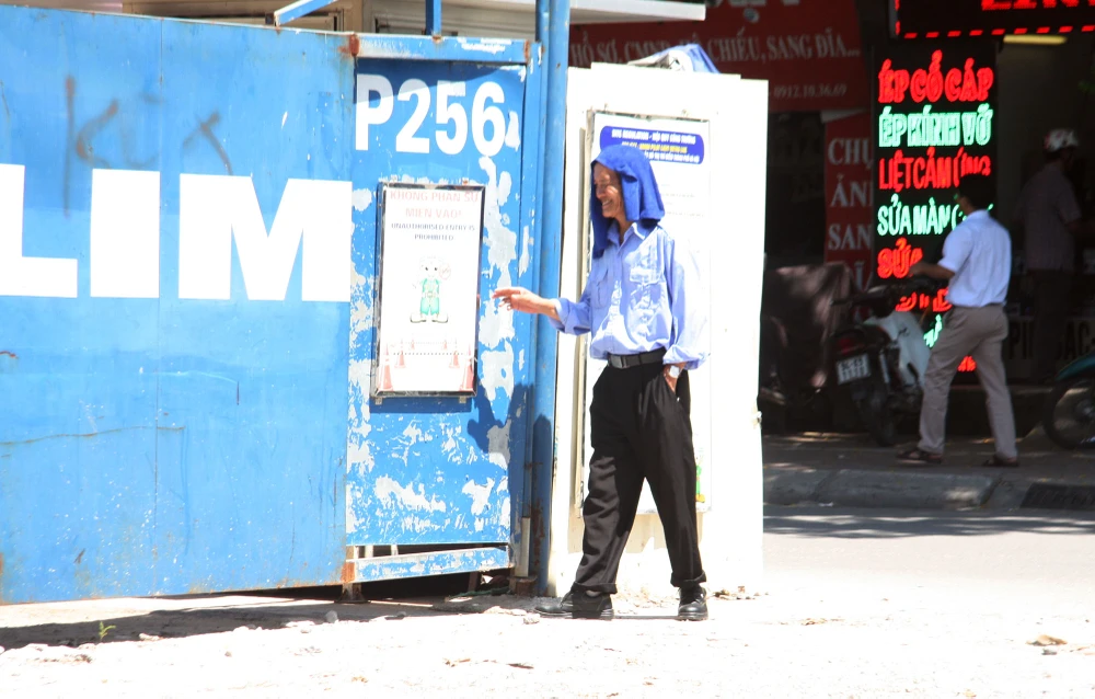 Một bác bảo vệ công trường đội chiếc khăn ướt lên đầu mong sao cho giảm bớt nhiệt.