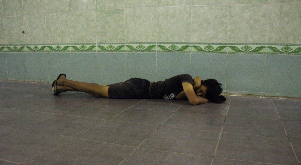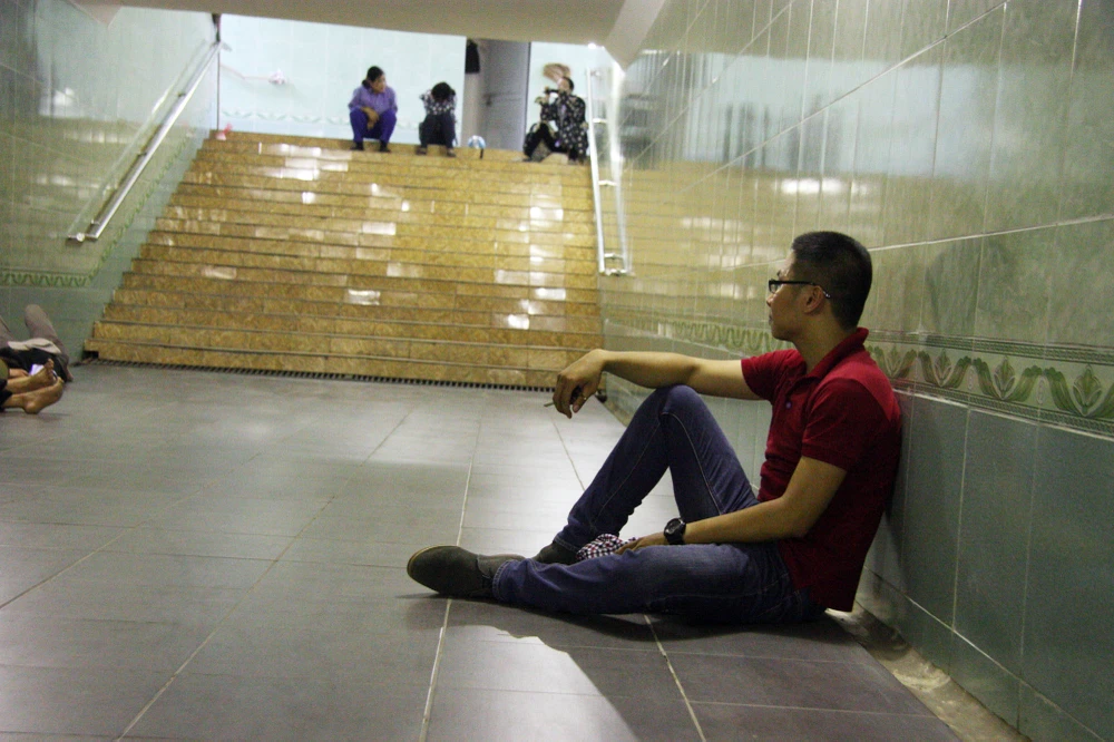 Chàng trai trẻ sau khi ở ngoài đường vào hầm, ngồi thụp xuống nền gạch tỏ vẻ mệt mỏi.