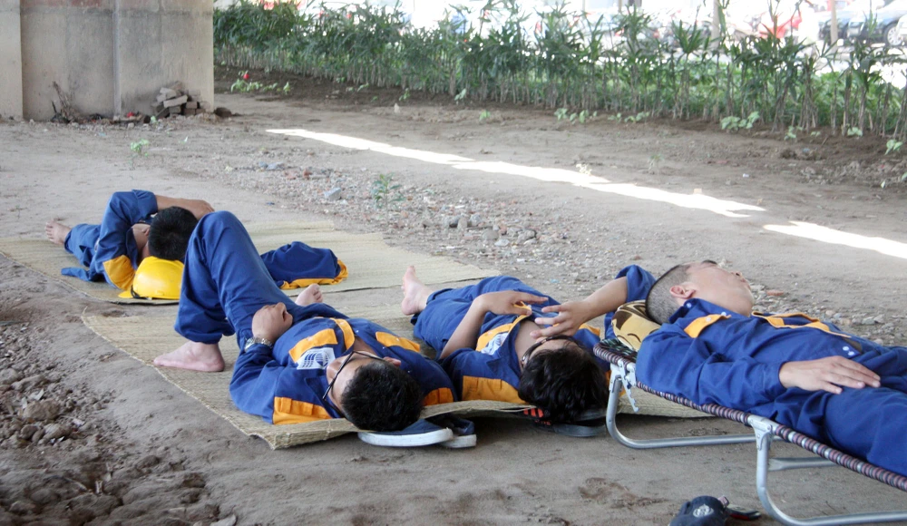 Những công nhân tranh thủ ngả lưng sau thời gian lao động mệt mỏi.