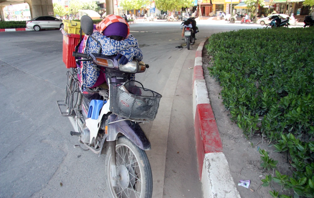 Một người phụ nữ tranh thủ dừng xe, nghỉ ngơi lấy sức trước khi tiếp tục một chặng đường dài.