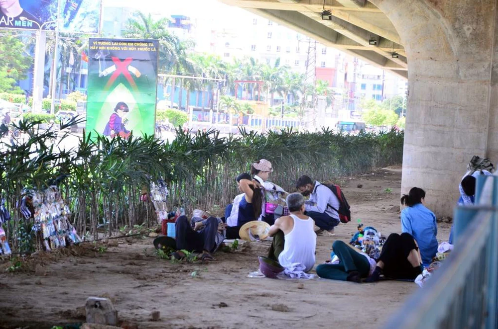 Bên trên, nhiều người bán hàng rong, người lao động, học sinh, sinh viên cũng chui vào gầm cầu Vành đai 3 nghỉ trưa, tránh nắng.