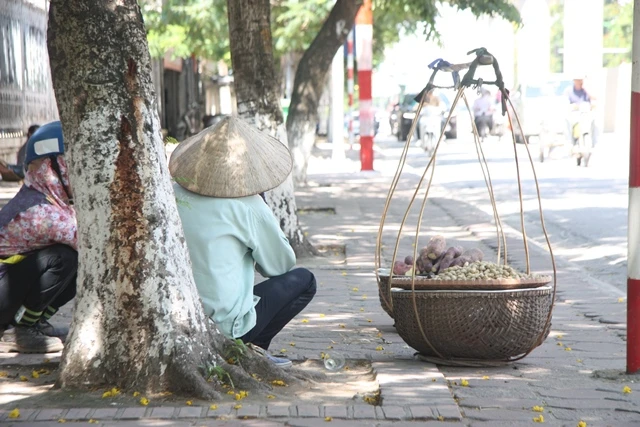 Người phụ nữ bán hàng dạo cũng tranh thủ ngồi tạm vào gốc cây ven đường vì trời quá nắng.