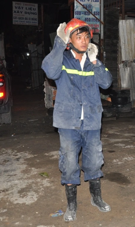 Chiến sĩ Dương Tấn Phát (Đội cứu nạn cứu hộ PCCC Tp.HCM) ngồi bệt trên thảm cỏ nghỉ ngơi sau nhiều giờ làm việc