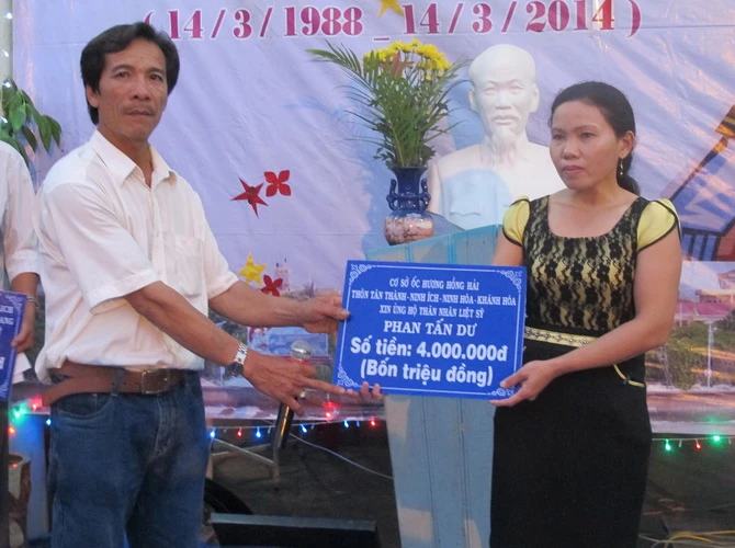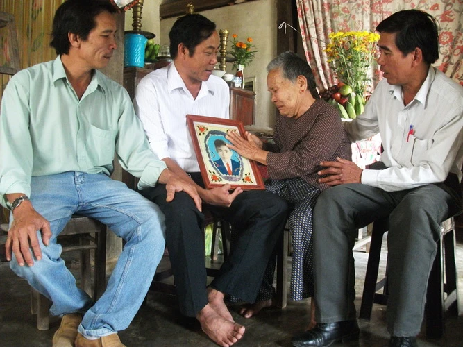 Các cựu binh Trường Sa thăm mẹ Lê Thị Niệm (86 tuổi, ngụ thôn Mỹ Thạnh Nam, xã Hòa Phong, huyện Tây Hòa, Phú Yên), mẹ của liệt sĩ Phan Tấn Dư hy sinh tại Trường Sa năm 1988.