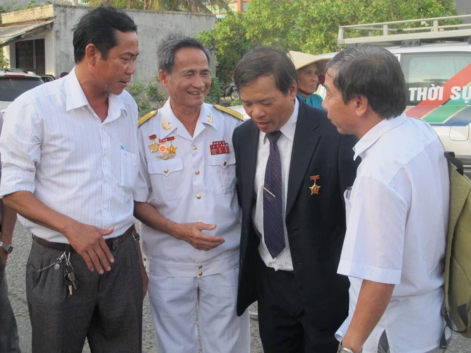 : Lê Xuân Bạ, nguyên Phó Chủ nhiệm chính trị Vùng 4 Hải quân trò chuyện cùng những cựu binh Trường Sa