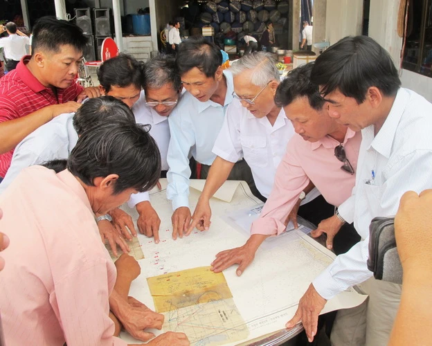 Đại tá Hồ Đắc Thạnh, nguyên thuyền trưởng tàu Không Số cùng các cựu binh Trường Sa xem lại bản đồ trận chiến bảo vệ đảo Gạc Ma