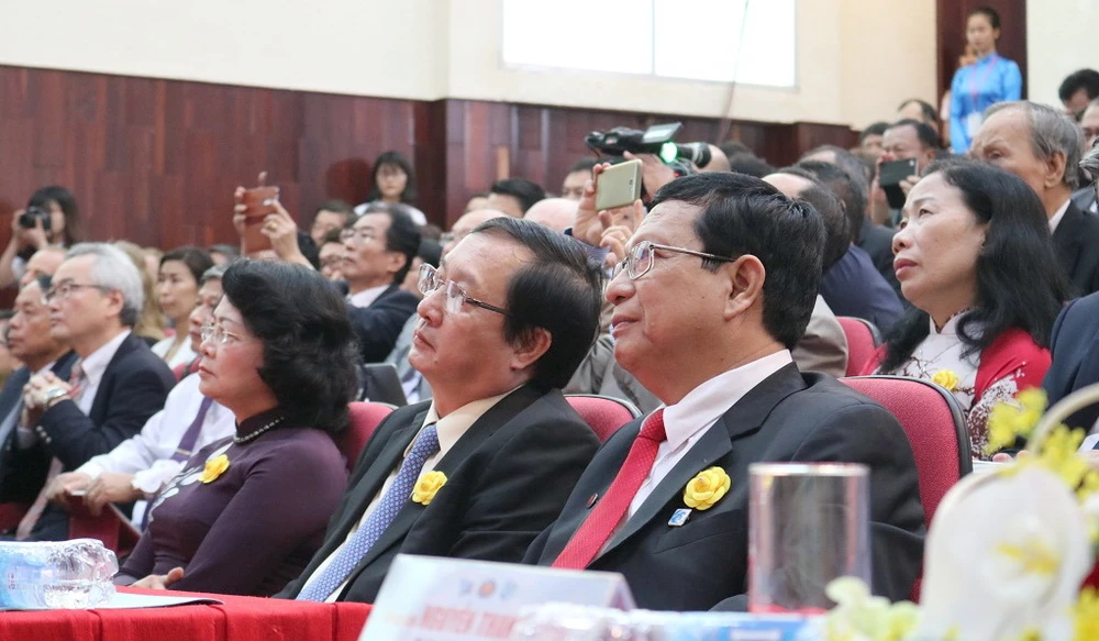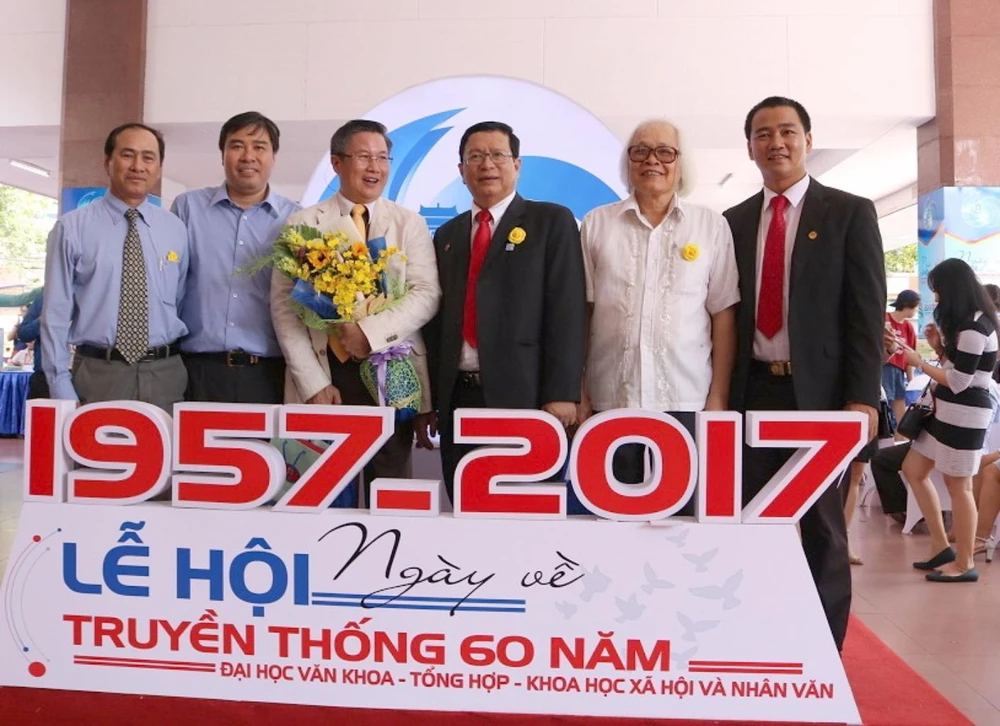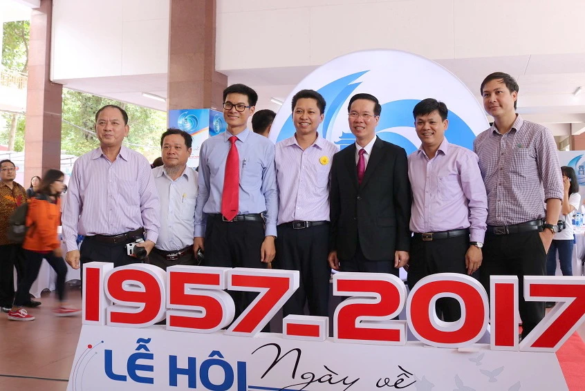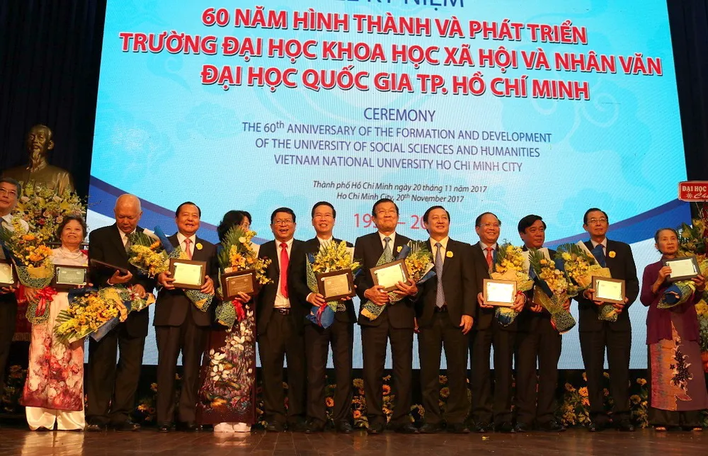 Bà Đặng Thị Ngọc Thịnh - Phó Chủ tịch nước, ông Trương Tấn Sang - nguyên Chủ tịch nước, ông Võ Văn Thưởng - Trưởng ban Tuyên giáo Trung ương, ông Tất Thành Cang - Phó Bí thư Thường trực Thành ủy TP.HCM... cùng nhiều cựu sinh viên tiêu biểu trong dịp kỷ niệm 60 năm thành lập Trường ĐH KHXH&NV. Ảnh: THANH TUYỀN