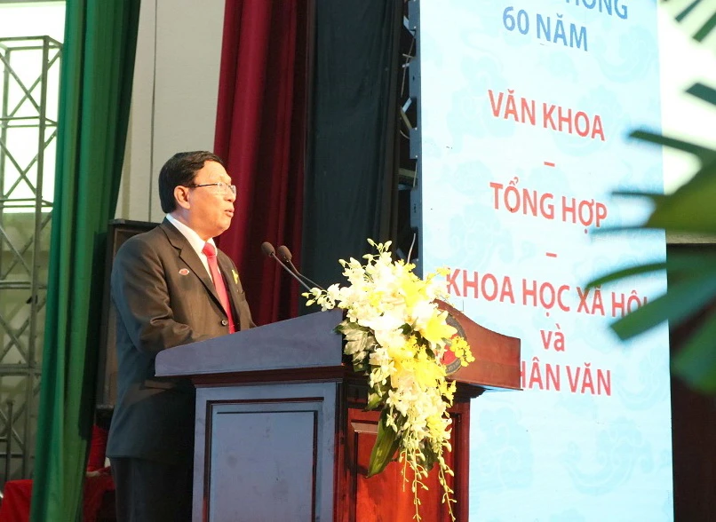 PGS-TS Võ Văn Sen, Hiệu trưởng Trường ĐH KHXH&NV, phát biểu tại buổi kỷ niệm. Ảnh: THANH TUYỀN
