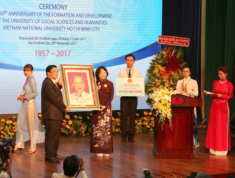 Bà Đặng Thị Ngọc Thịnh - Phó Chủ tịch nước tặng ảnh chân dung Bác cho ĐH KHXH&NV cùng 50 triệu đồng cho quỹ vì học sinh nghèo hiếu học của trường. Ảnh: THANH TUYỀN