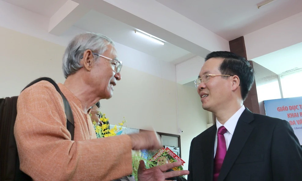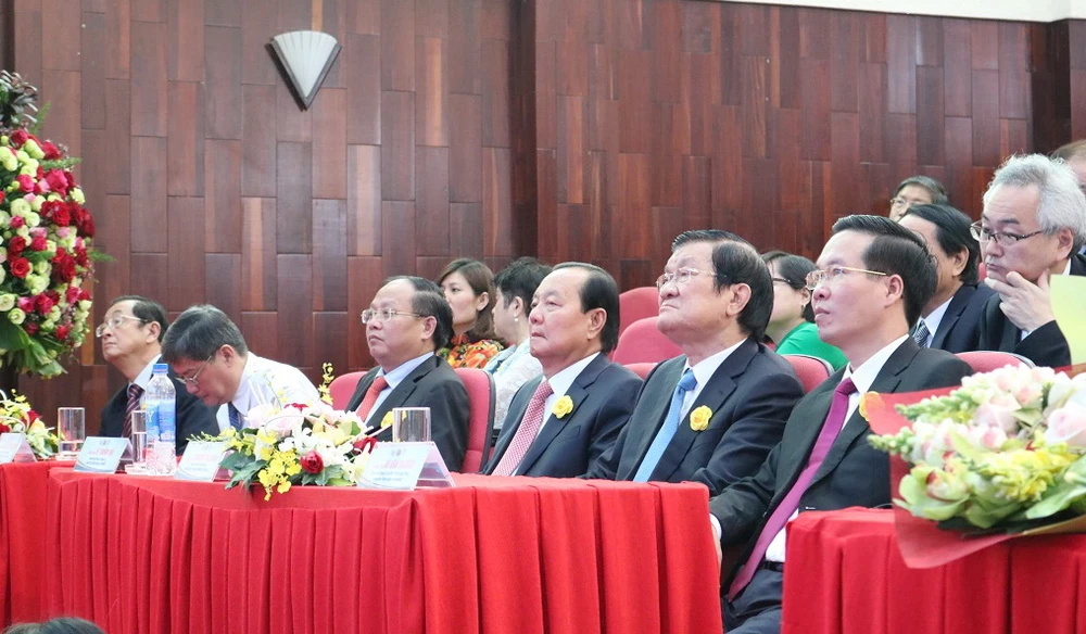Bà Đặng Thị Ngọc Thịnh - Phó Chủ tịch nước, ông Trương Tấn Sang - nguyên Chủ tịch nước, ông Võ Văn Thưởng - Trưởng ban Tuyên giáo Trung ương, ông Tất Thành Cang - Phó Bí thư Thường trực Thành ủy TP.HCM... cùng đến tham dự kỷ niệm 60 năm thành lập trường... Ảnh: THANH TUYỀN
