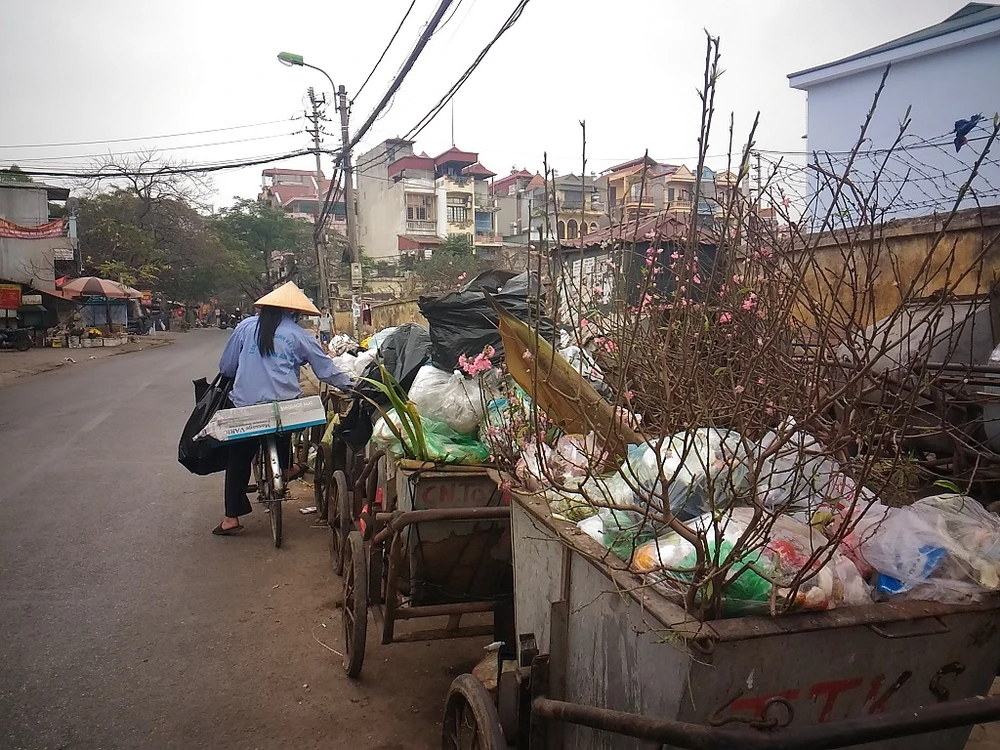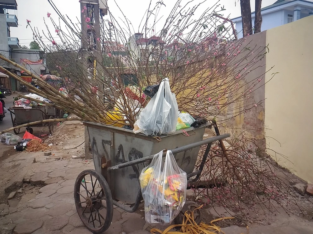 Những ngày này, hình ảnh dễ dàng bắt gặp tại Hà Nội ở khắp các con phố là các thùng rác chất đầy hoa đào. Số hoa này được các gia đình vứt bỏ, sau khi mua về để làm đẹp nhà. Đây cũng là dấu hiệu rõ nhất cho thấy "Tết đã hết!".