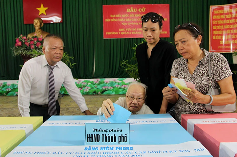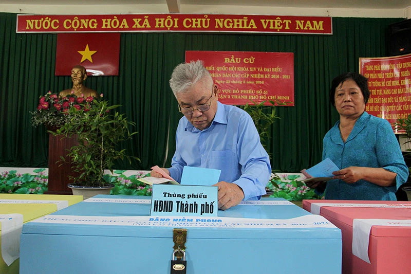 Bà Ngô Thị Huệ - Phu nhân cố Tổng Bí thư Nguyễn Văn Linh bỏ phiếu bầu vào thùng phiếu.