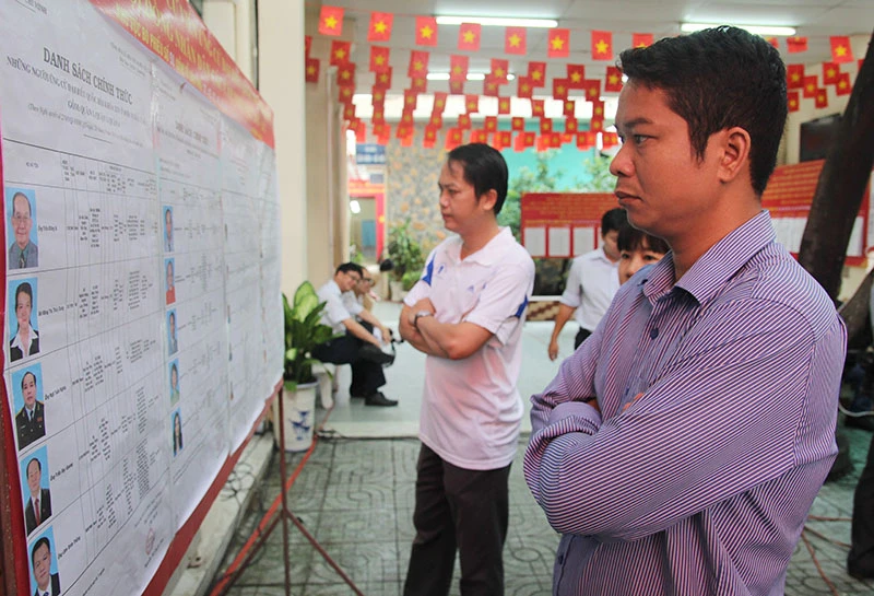 Sau khi nhận phiếu bầu cử, các cử tri tranh thủ đọc kỹ để chọn lựa các ứng cử viên lần cuối trước khi vào phòng gạch phiếu.