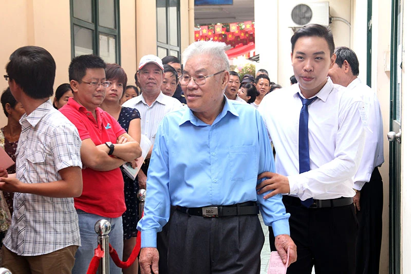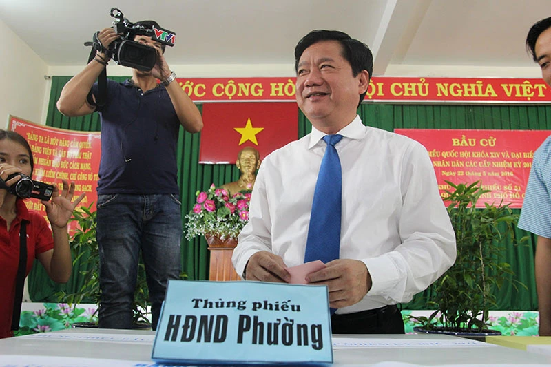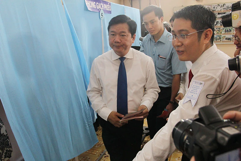 Tại đơn vị bầu cử này có cử tri Đinh La Thăng - bí thư Thành ủy TP.HCM. Như thường lệ, Bí thư Thăng đến sớm hơn 30 phút trước giờ khai mạc bầu cử để trao đổi với các cử tri.