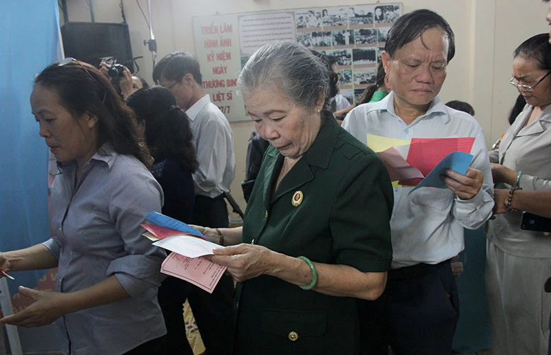 Bà Ngô Thị Huệ - Phu nhân cố Tổng Bí thư Nguyễn Văn Linh nhận phiếu bầu cử.