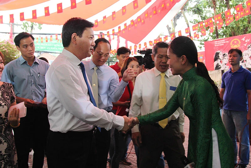 Bí thư Thành ủy TP.HCM Đinh La Thăng vui vẻ bắt tay các cử tri tại đơn vị.
