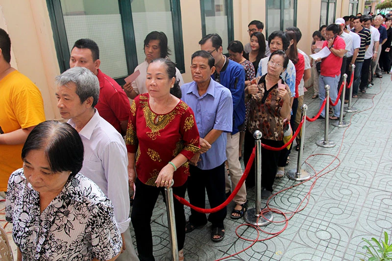 Các cử tri lần lượt xếp hàng vào phòng bỏ phiếu.