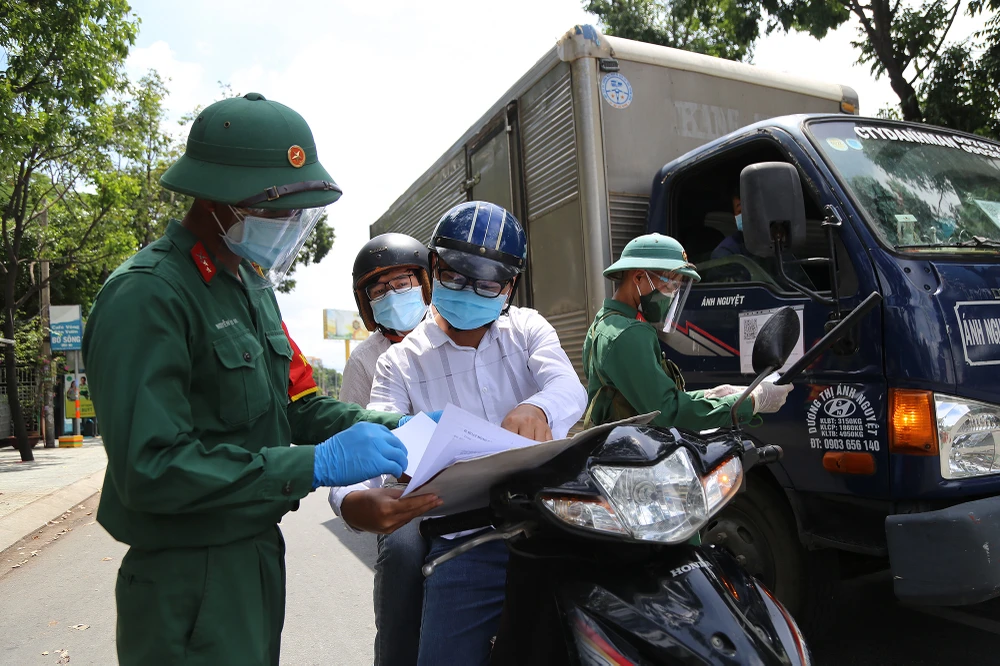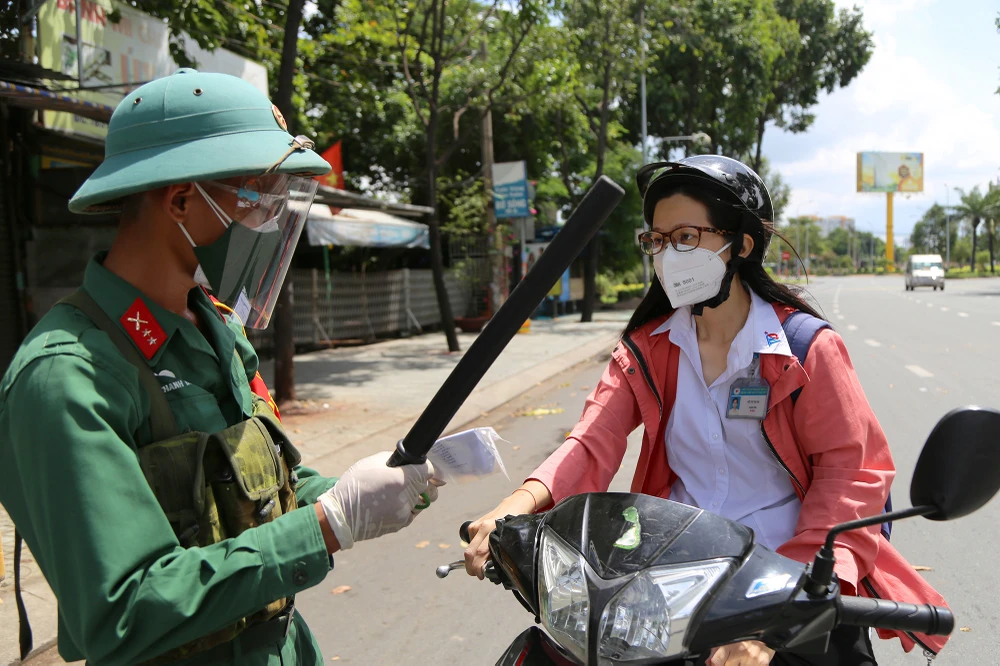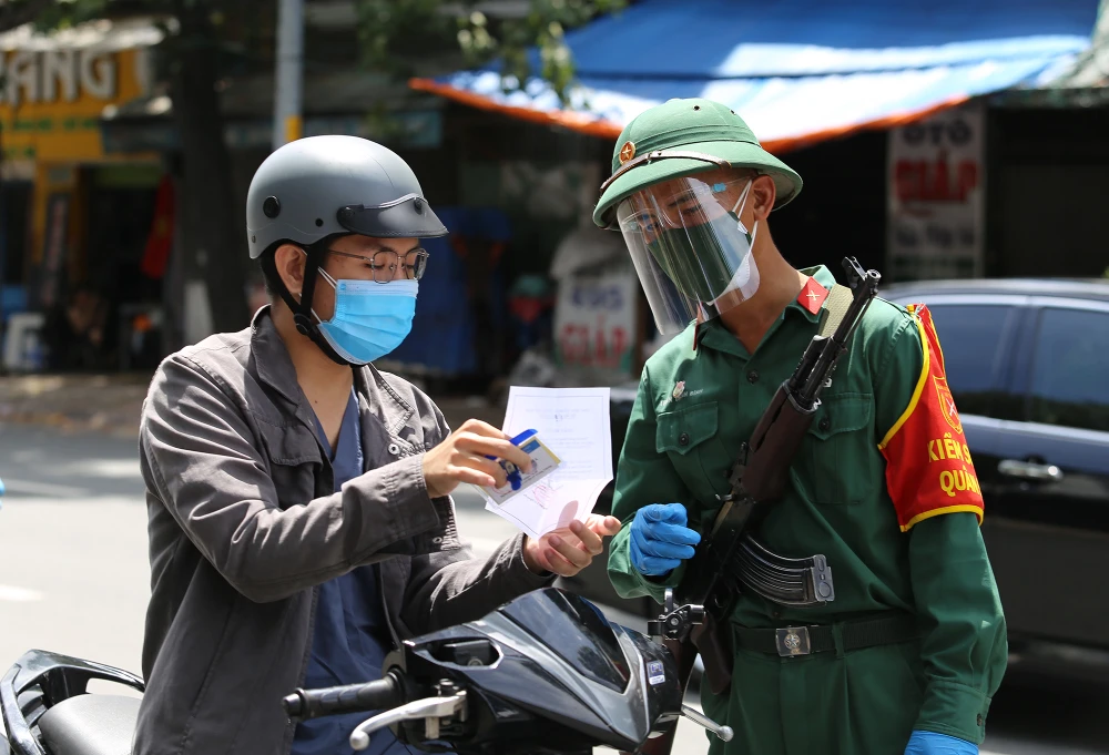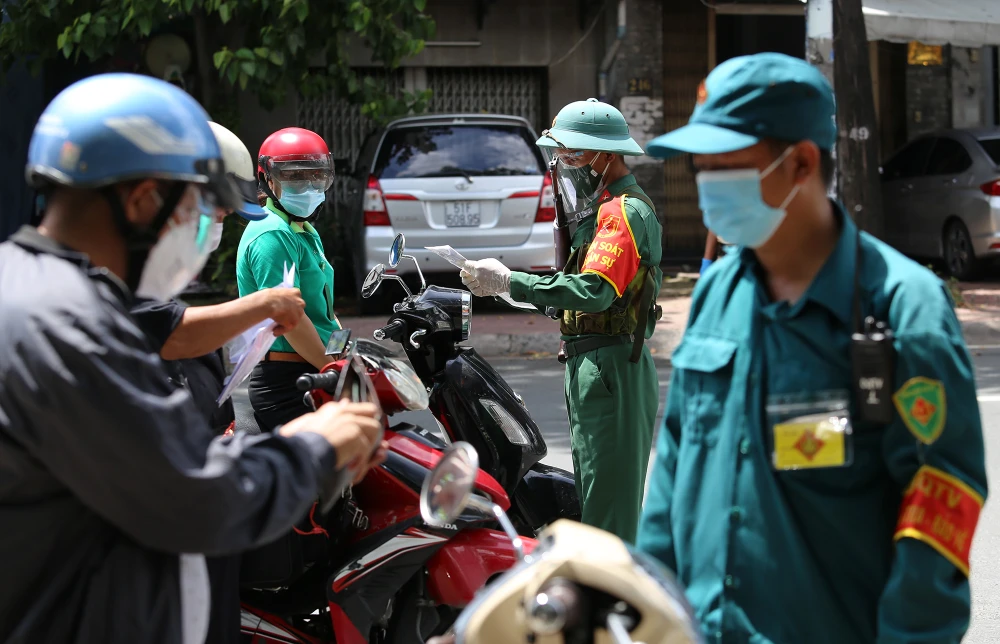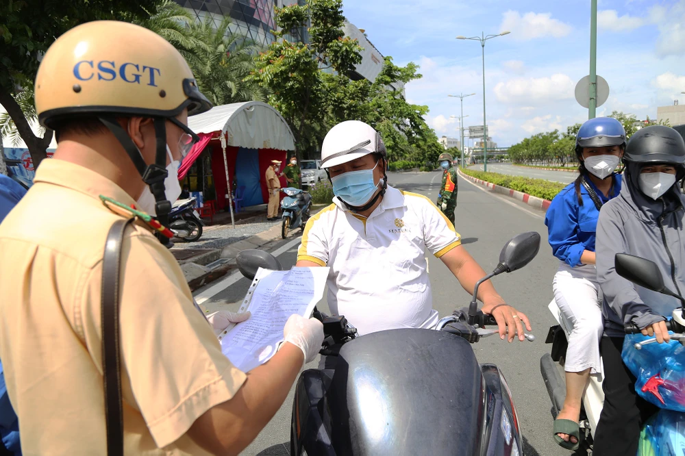 Người dân xuất trình giấy đi đường khi được kiểm tra, hầu hết là người thực hiện nhiệm vụ chống dịch, người làm việc trong các lĩnh vực được phép ra đường thời gian TP siết chặt giãn cách.