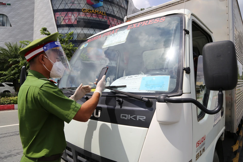 Chiến sĩ công an dùng điện thoại quét mã QR đối với xe chở hàng di chuyển qua địa bàn quận Thủ Đức.
