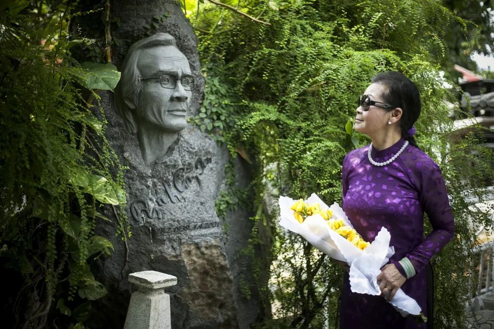 Đến viếng thăm mộ nhạc sĩ, ca sĩ Khánh Ly đã chuẩn bị một bó hoa hồng vàng tươi thắm.