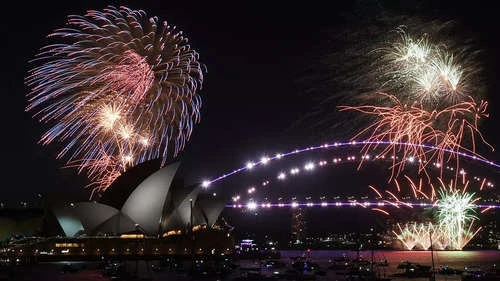 Pháo hoa rực rỡ bên trên Nhà hát Sydney và cầu cảng Sydney trong đêm giao thừa 31-12. Ảnh: TIME OF INDIA