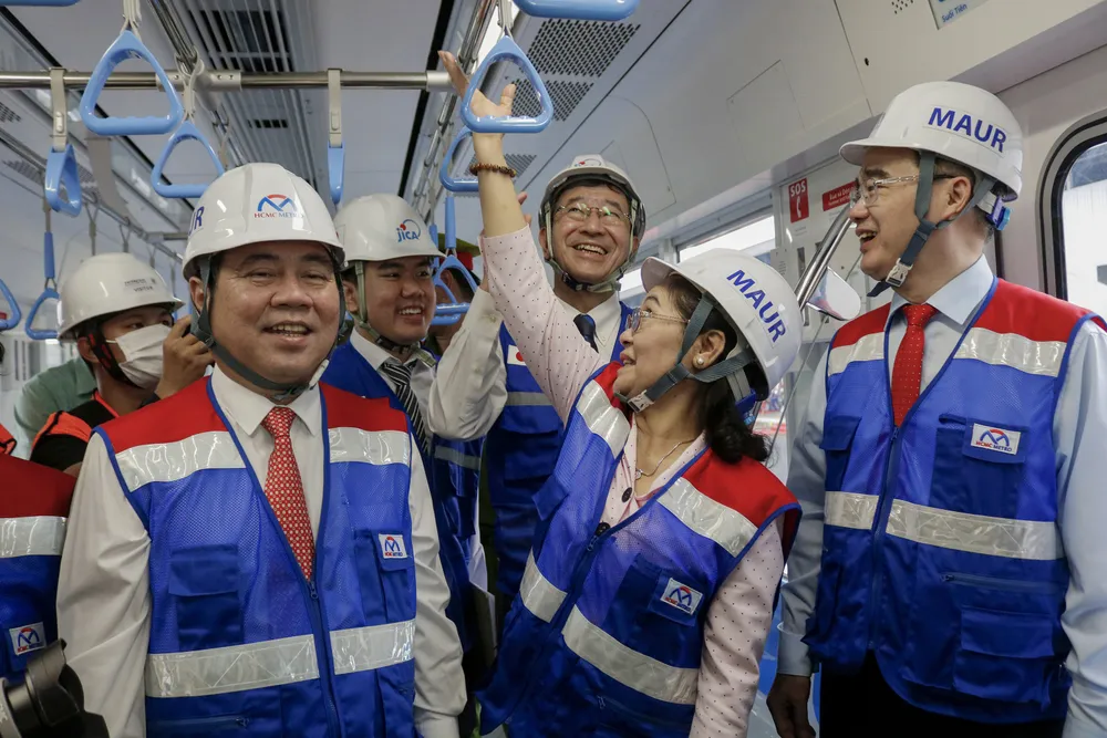 Ủy viên Bộ Chính trị, Bí thư Thành ủy TP.HCM Nguyễn Thiện Nhân; Phó Bí thư Thành ủy, Chủ tịch UBND TP.HCM Nguyễn Thành Phong cùng ông Yamada Takio, Đại sứ đặc mệnh toàn quyền của Nhật Bản tại Việt Nam tham quan toa tàu sáng 13-10.