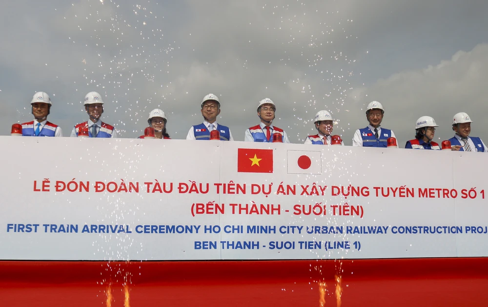 Các lãnh đạo TP.HCM và Đại sứ đặc mệnh toàn quyền của Nhật Bản tại Việt Nam trong buổi lễ đón tàu metro số 1.