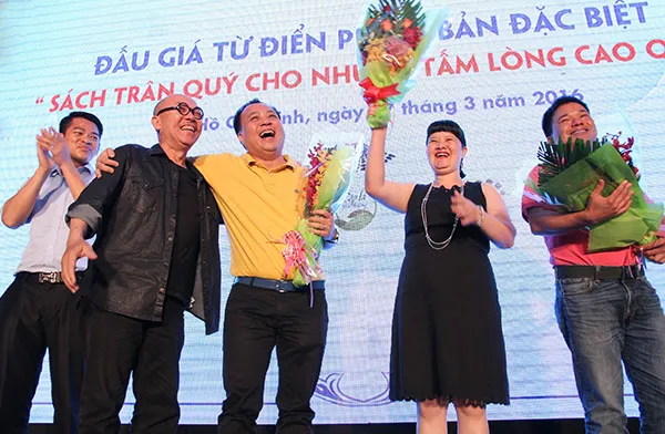 Ba chủ nhân (ôm hoa) hạnh phúc khi trở thành chủ nhân của 3 cuốn từ điển. Từ phải sang: Anh Phan Minh Thông, chị Phạm Thị Tuyết Nhung và anh Nguyễn Minh Vinh. Ảnh: HOÀNG GIANG