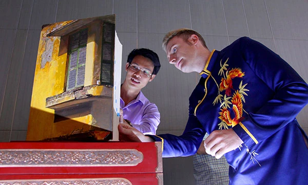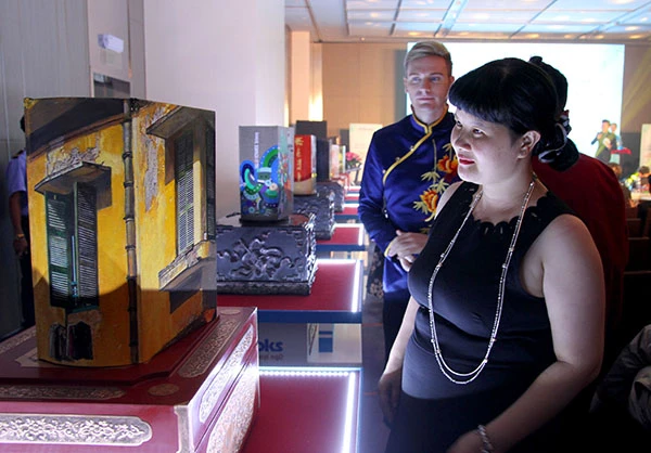 Ba trong số sáu cuốn sách đặc biệt này được bán đấu giá để quyên tiền từ thiện tặng cho các học sinh nghèo được có thêm cơ hội đến trường. Ảnh: Ca sĩ Kyo York đang xem cuốn từ điển với trang bìa "Phố cổ Hà Nội "do họa sĩ Phạm Bình Chương thiết kế. Ảnh: HOÀNG GIANG