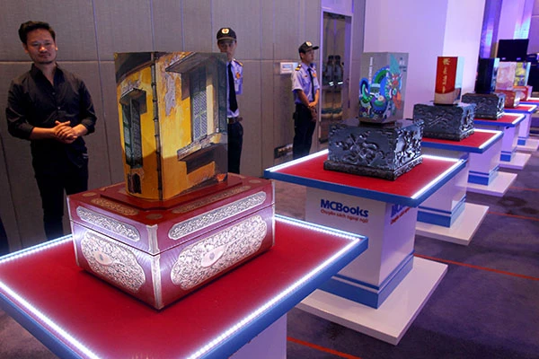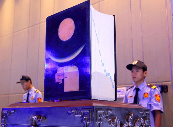 Sáu cuốn sách có kích cỡ đặc biệt, nặng 14 kg, được sản xuất bằng giấy trắng ngọc trai xuất xứ từ Nhật, đơn vị sản xuất cho biết bộ sách có độ bền lên tới 500 năm. Khách tham quan các cuốn từ điển tại khách sạn Pullman. Ảnh: HOÀNG GIANG