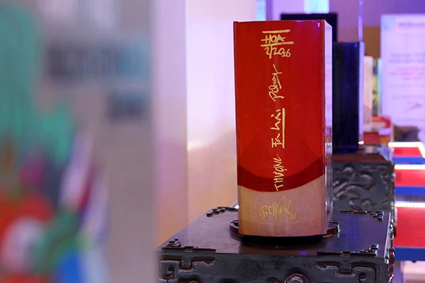 Buổi đấu giá do MCBooks cùng với 5 họa sĩ Thành Chương, Đặng Xuân Hòa, Phạm An Hải, Phan Cẩm Thượng, Phạm Bình Chương (trang trí bìa cho 6 cuốn sách) phối hợp tổ chức. 6 cuốn sách được trưng bày tại buổi đấu giá. Ảnh: HOÀNG GIANG