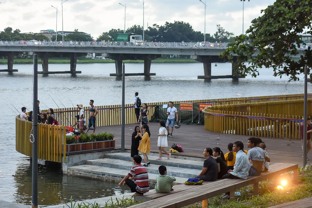 Người dân nghỉ chân ngồi ngắm mặt trời lặn. Ảnh: N.DO
