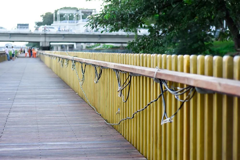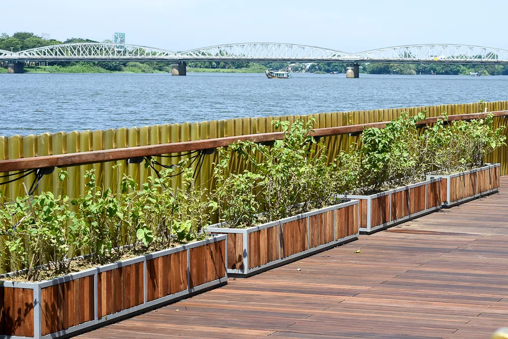 Những chậu cây được làm bằng gỗ, khung kim loại đặt dọc đường đi của cầu đi bộ. Ảnh: N.DO