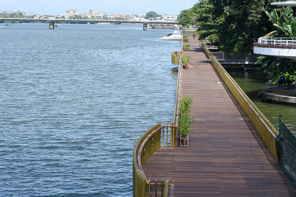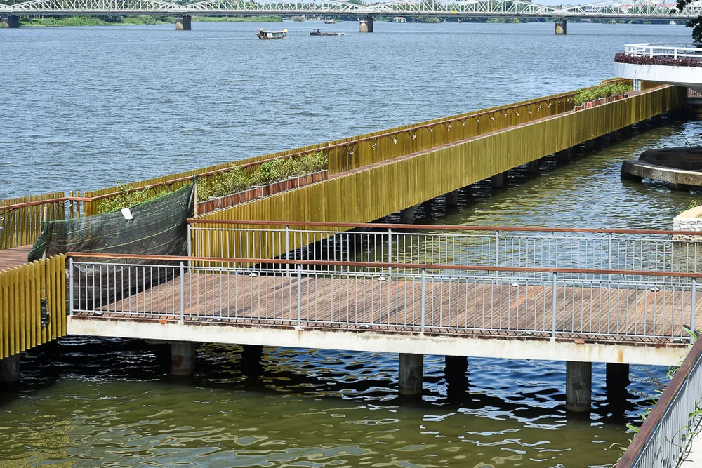 Được khởi công từ đầu năm 2018, công trình đường đi bộ trên sông Hương nằm trong dự án xây dựng mạng lưới kết nối hệ thống tuyến đường đi bộ phía Nam sông Hương (TP Huế) do Tổ chức Koica (Hàn Quốc) tài trợ không hoàn lại 100%. Ảnh: N.DO