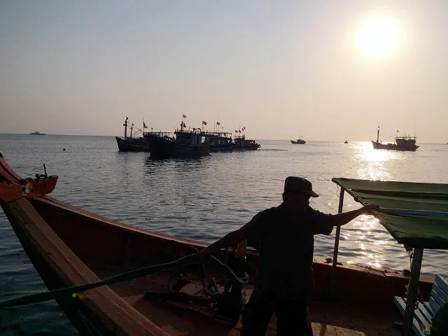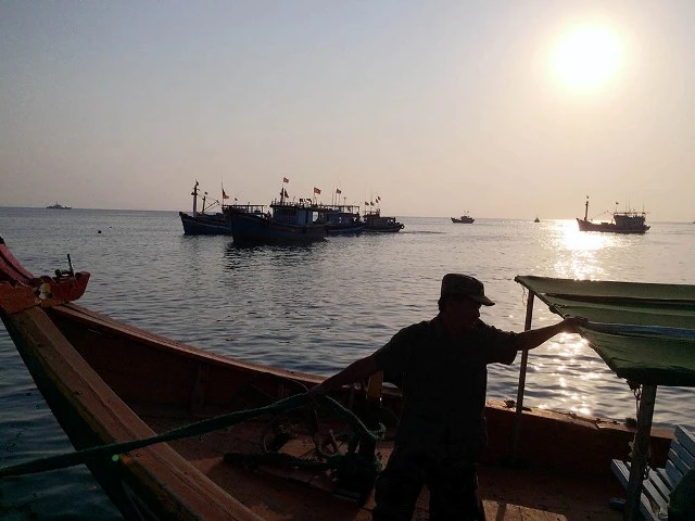Hoàng hôn trên cầu cảng Lý Sơn, cũng là lúc những con tàu nhỏ đánh bắt đêm cách đảo 4-5 hải lý chuẩn bị ra khơi.