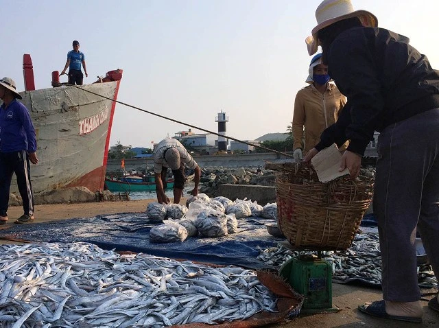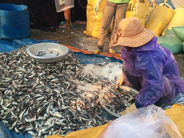 Cá đánh bắt được ướp muối ngay tại cầu cảng, toàn bộ số cá này đều được làm mắm.