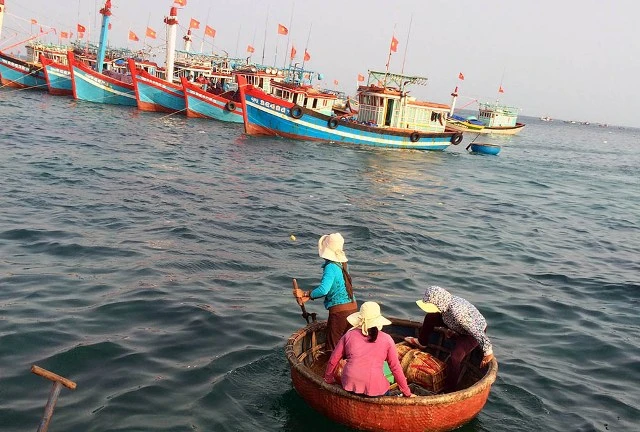 Những người phụ nữ Lý Sơn chuẩn bị thực phẩm, đồ dùng đi biển cho chồng, con ra khơi.