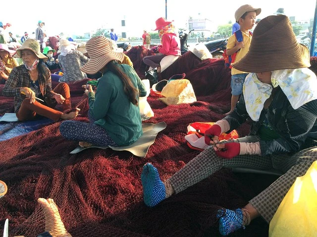 Vá, gỡ lưới bên cầu cảng để chuẩn bị cho chuyến ra khơi tới.