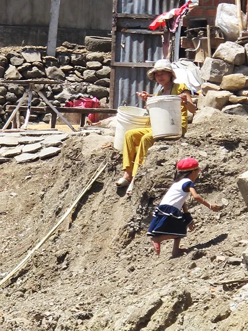 Trẻ em, người lớn ở xã Xuân Thọ, thị xã Sông Cầu đều phải leo lên leo xuống hố sâu để vào nhà.