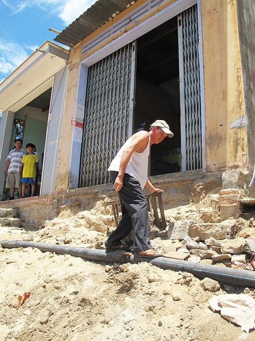 Một người lớn tuổi ở phường Xuân Đài, thị xã Sông Cầu (Phú Yên) phải bò qua con rãnh sâu để leo lên nhà.