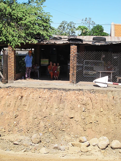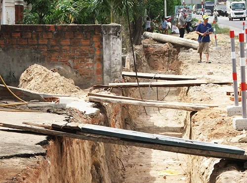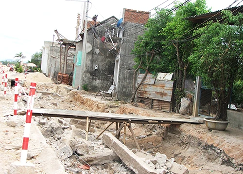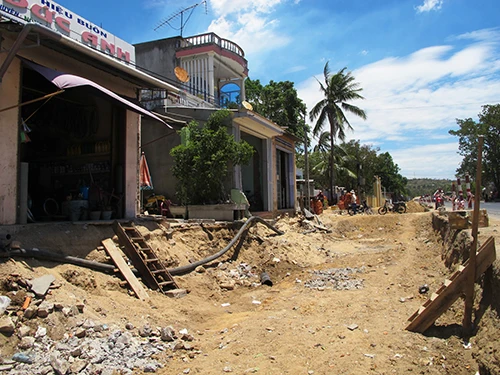 Vốn là những khu dân cư khá sầm uất, các dãy nhà dọc quốc lộ 1 đoạn qua xã Cát Tân, huyện Phù Cát (Bình Định) nay đầy hầm hố ngổn ngang. Trước mặt các ngôi nhà là một “giao thông hào” dài hàng trăm mét, rộng 2-4m, sâu hơn 2 m khiến người dân không còn lối ra vào.