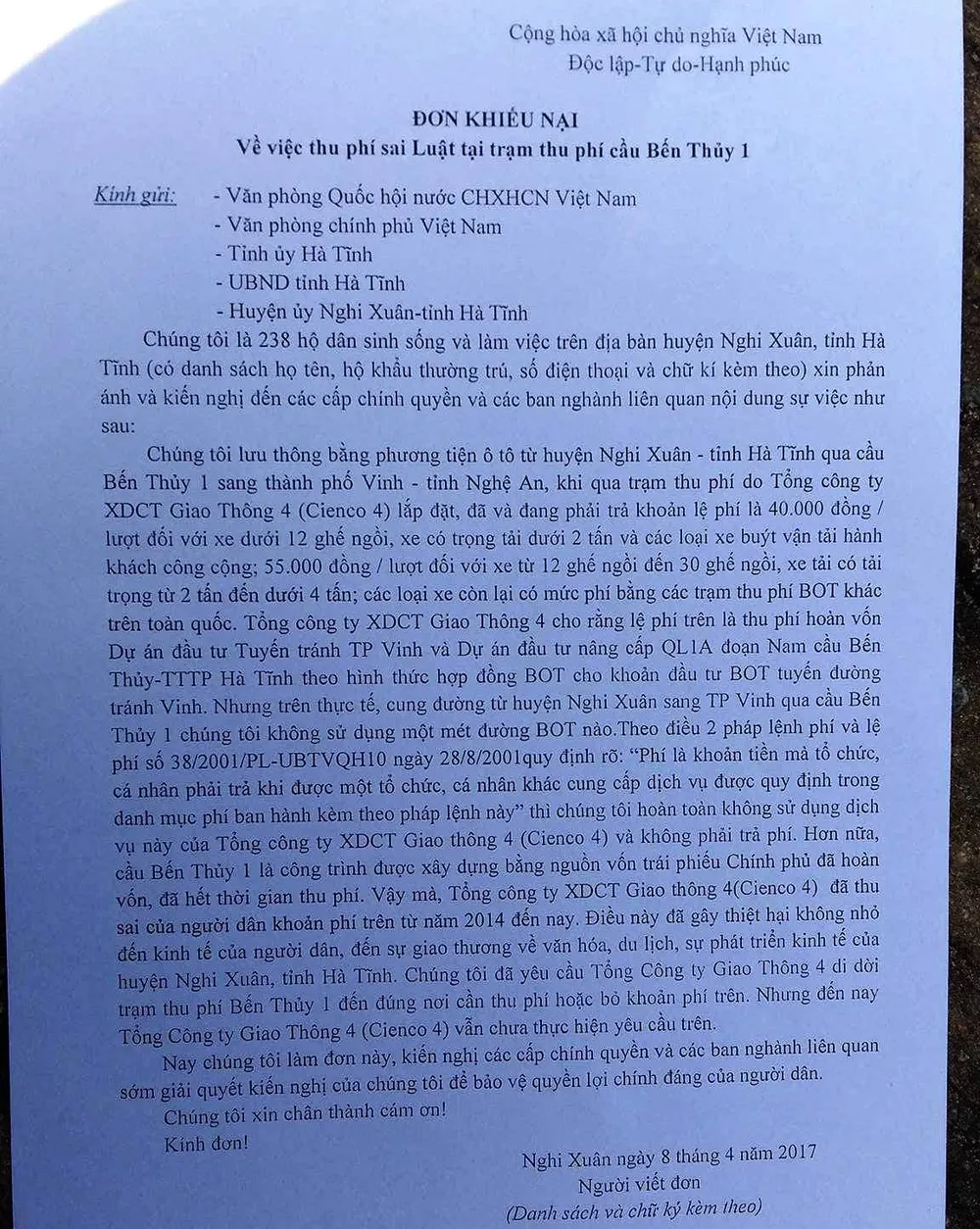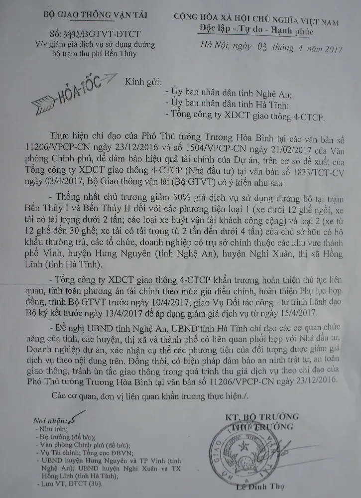 Bộ GTVT đã có văn bản giảm 50% phí qua trạm Bến Thủy 1 và Bến Thủy 2 từ ngày 15-4-2017 nhưng nhiều người dân không đồng tình.