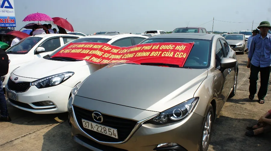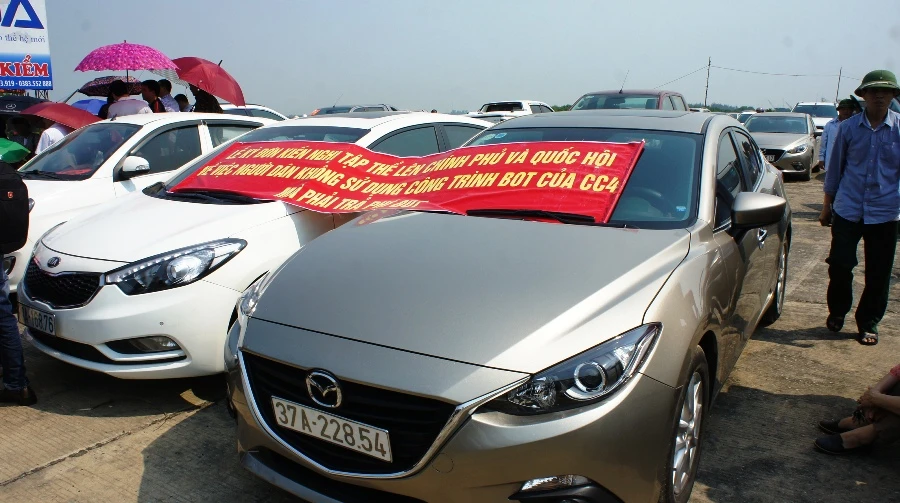 Sáng 9-4, người dân lại mang ô tô ra đỗ ở đường ven sông Lam (huyện Nghi Xuân, Hà Tĩnh) để cùng ký đơn, không chấp nhận giảm 50% phí qua trạm Bến Thủy 1 mà yêu cầu miễn hoặc di dời trạm.