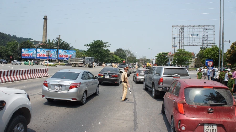 CSGT Công an TP Vinh rất vất vả phân luồng, chỉ dẫn để giải tỏa ách tắc.
