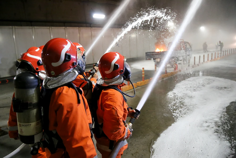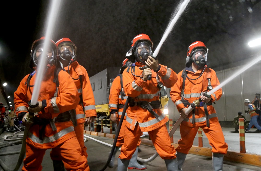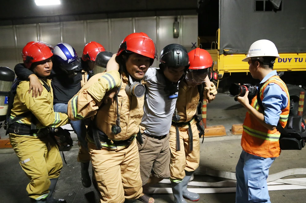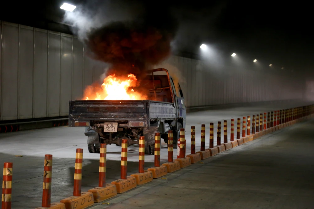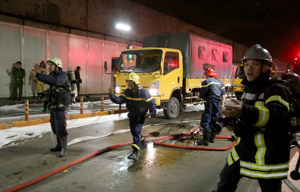 Tình huống giả định được đưa ra vào lúc 14 giờ ngày 27-10, xe tải 2 tấn chở hàng hóa đang lưu thông qua đường hầm sông Sài Gòn hướng từ quận 1 sang quận 2, khi đến vị trí khu vực gần cửa hầm phía quận 2, do tài xế chạy quá tốc độ không làm chủ được tay lái nên đã va chạm vào xe tải khác đang lưu thông cùng chiều dẫn đến xảy ra tai nạn giao thông.