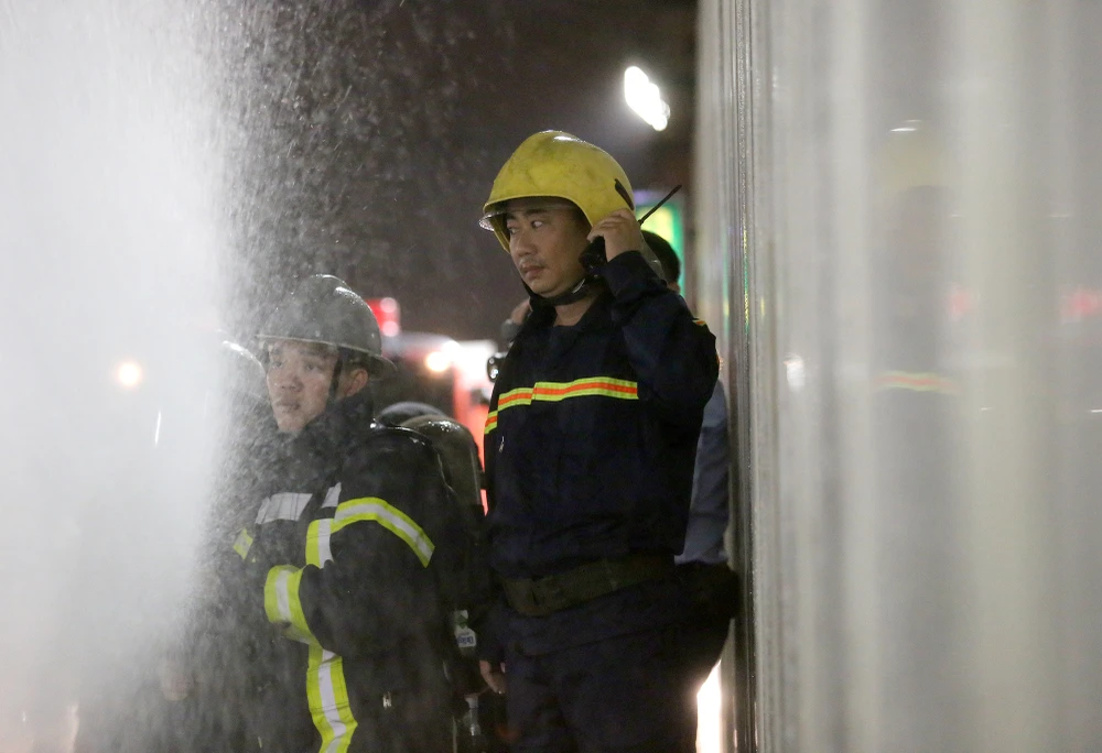 Các chiến sĩ phun hóa chất chống cháy kết hợp với nước.