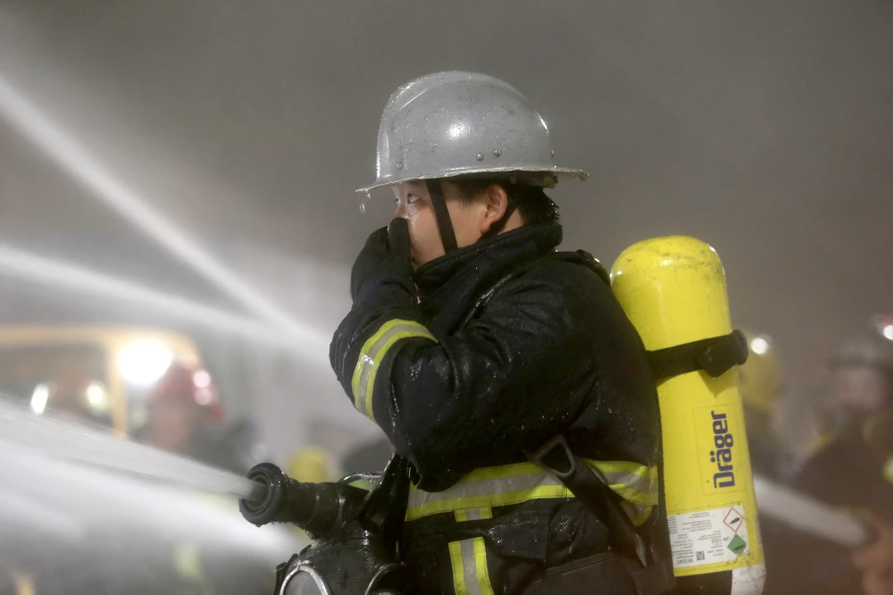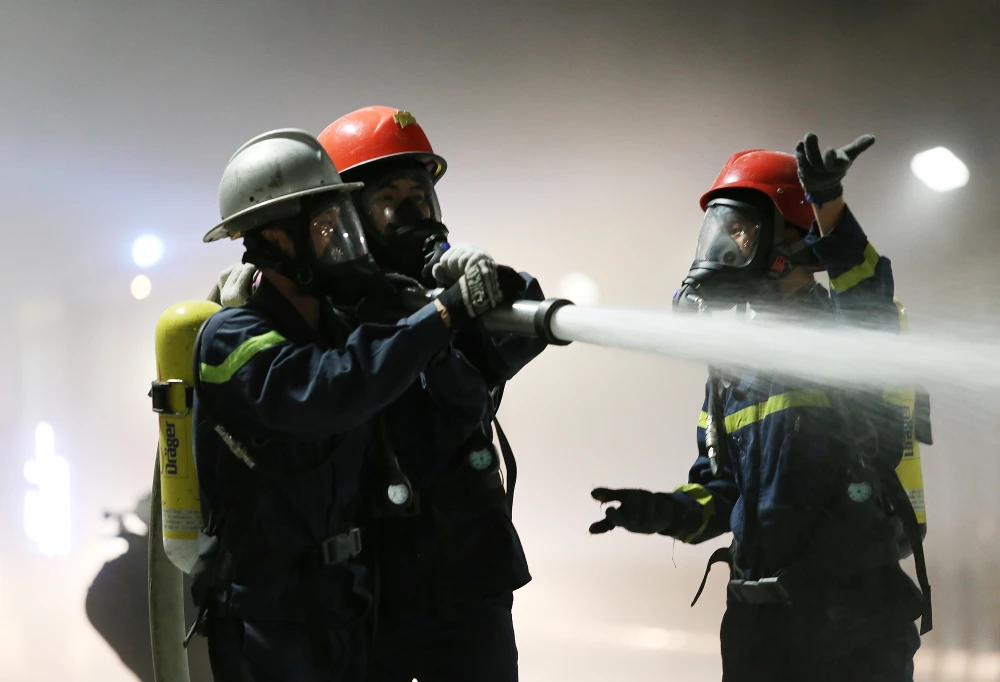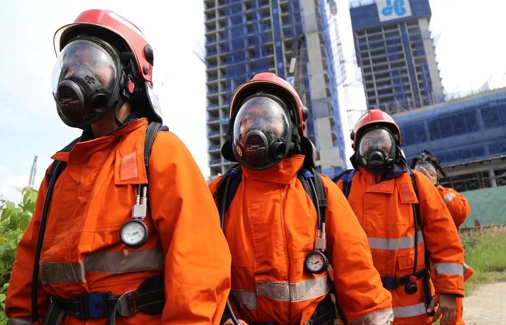 Lực lượng PCCC và cứu nạn, cứu hộ mặc trang phục bảo hộ chuẩn bị vào diễn tập.